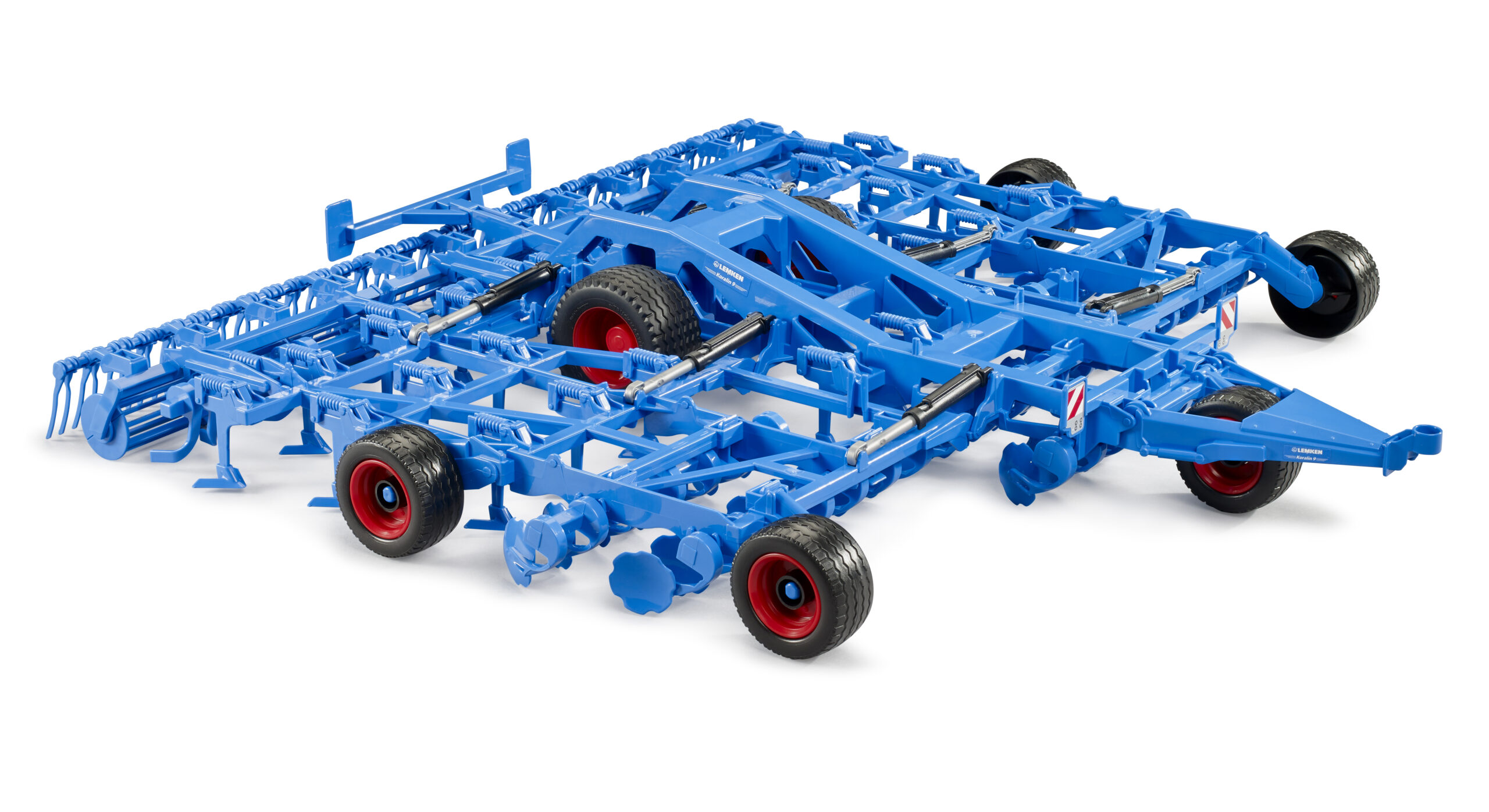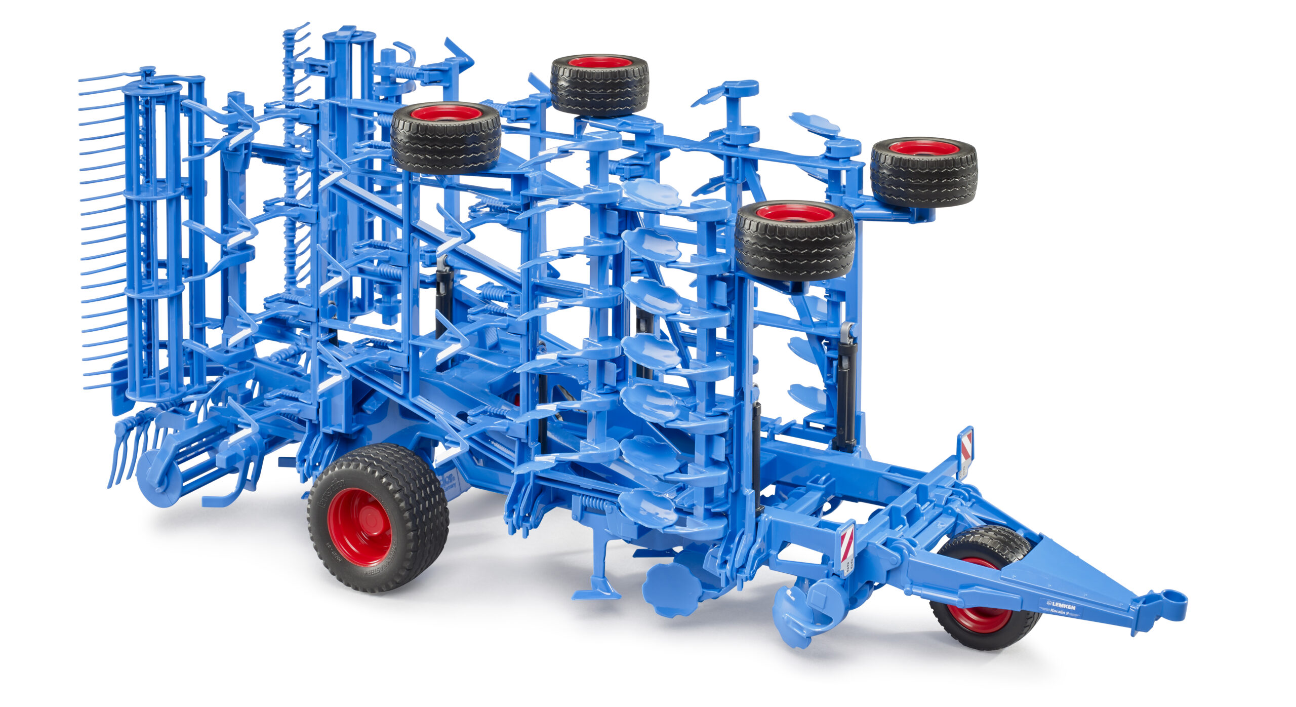 Once in the field, the unit unfolds to cover a wide working area, displaying its true scale. The trailing rollers rotate mechanically as the vehicle moves, smoothing the earth behind the tines. A lever on the chassis operates the switch from transport to work mode, engaging the running gear. Compatible with all Professional series tractors, this lemken cultivator koralin 9 is a robust addition to any collection, crafted from high-quality plastics for durable indoor and outdoor play.