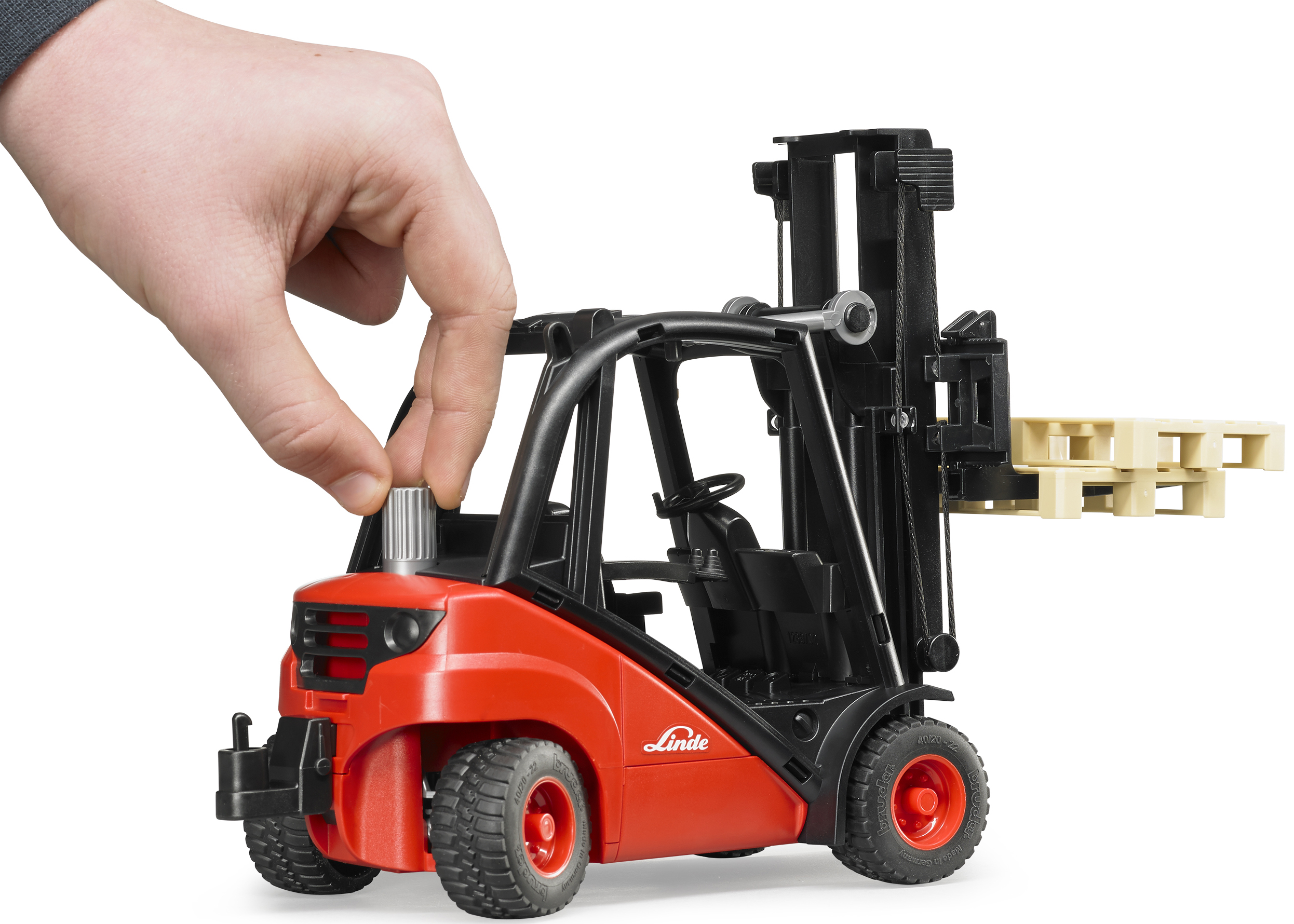 The Linde forklift toy is a perfect replica of the H30D industrial stacker, capturing the sleek Porsche design of the original vehicle. It features a double-stage lift mast that can be operated with one hand, allowing children to raise and lower loads smoothly. To ensure goods stay secure during transport, the entire mast can be tilted back using the hydraulic pitch cylinders mounted on the roof, adding a fantastic layer of realism to every play session. Whether stacking goods in a model warehouse or moving supplies around the farmyard, the Linde forklift toy offers hours of engaging, hands-on fun.
