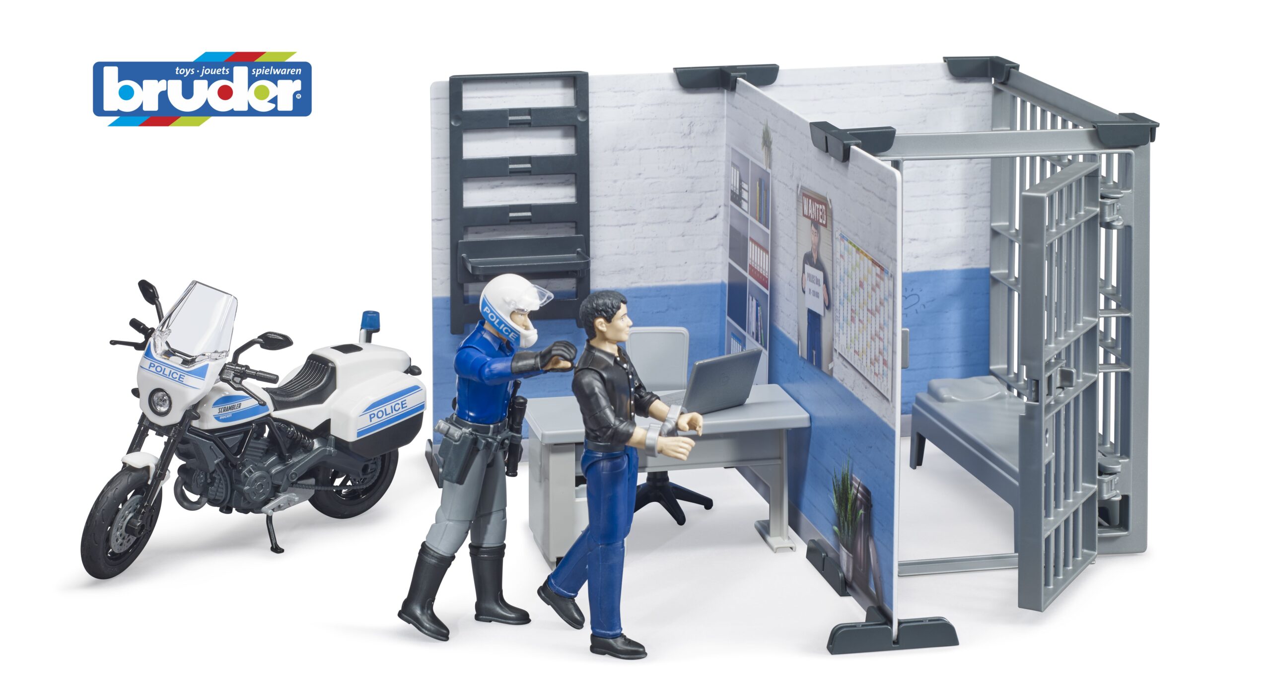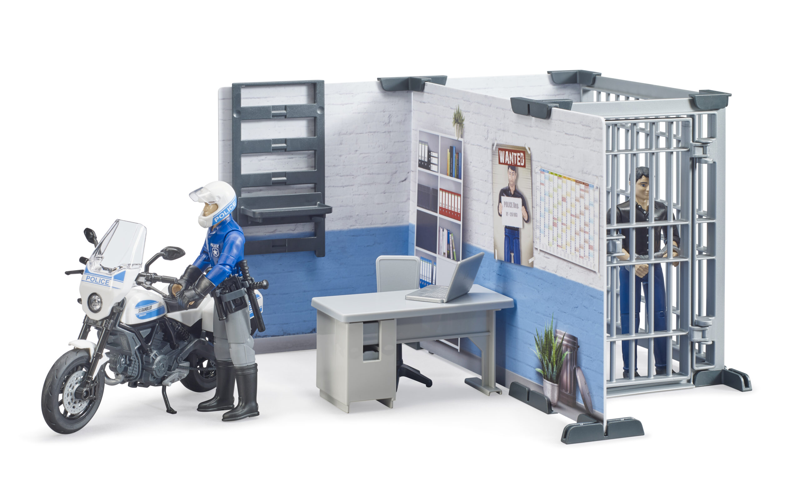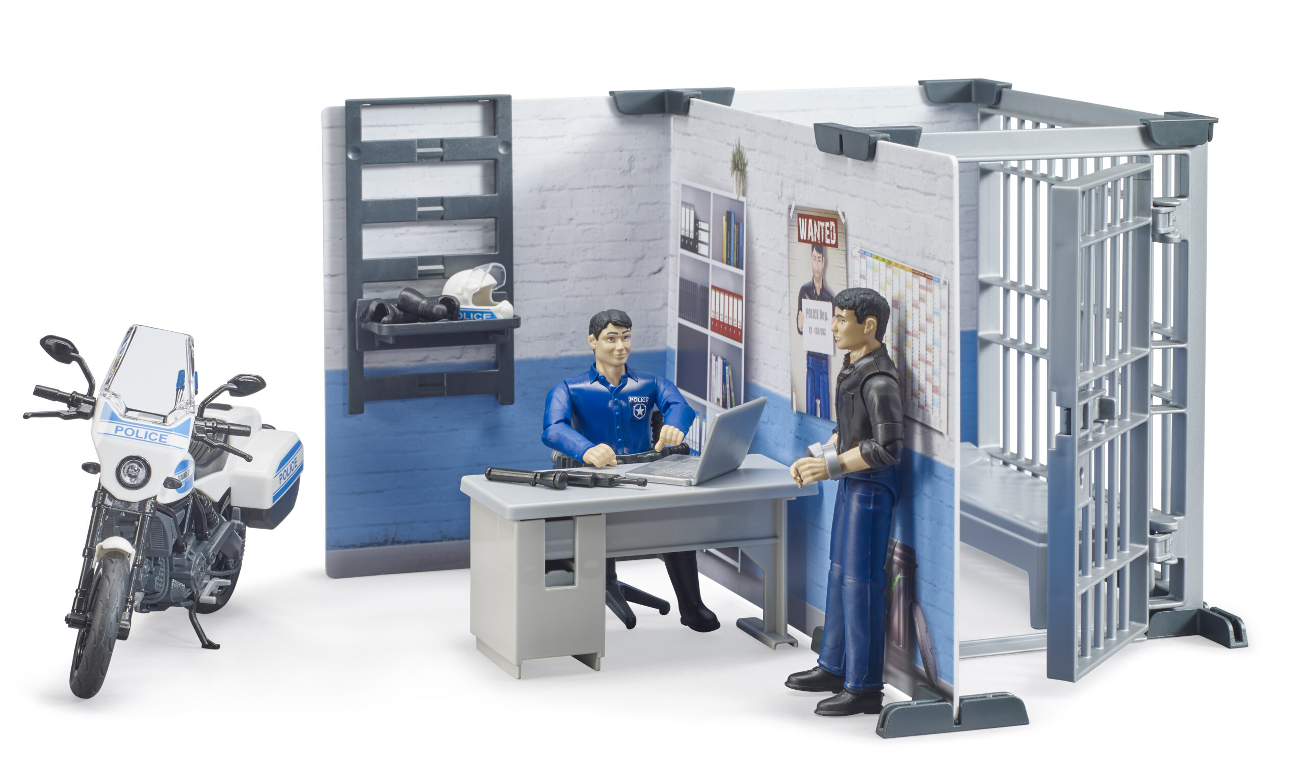 Coordinate all law enforcement activities from this central hub. This detailed set features a fully equipped office area with a desk, chair, and computer, where the officer can log reports and monitor the radio. When a suspect is apprehended, the station includes a secure holding cell with a lockable door and a bunk bed, ensuring detained individuals are kept safe until transfer. The printed wall elements create an immersive backdrop, complete with shelves for storing equipment like the radio and baton.