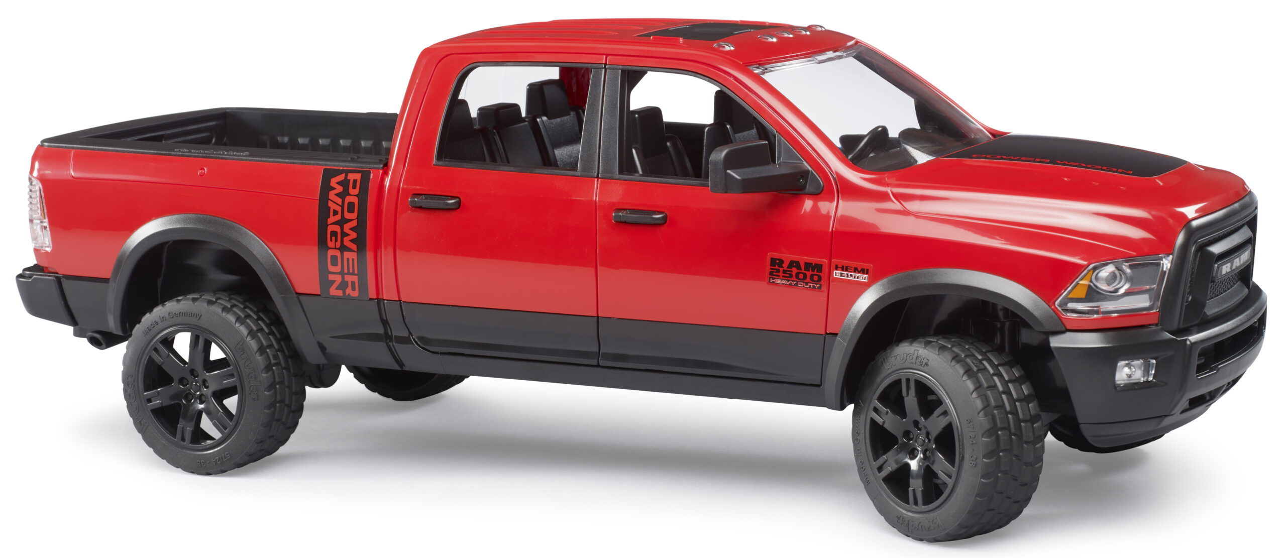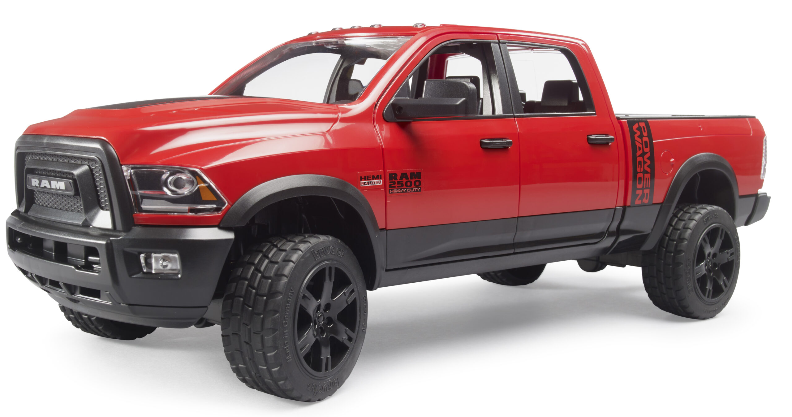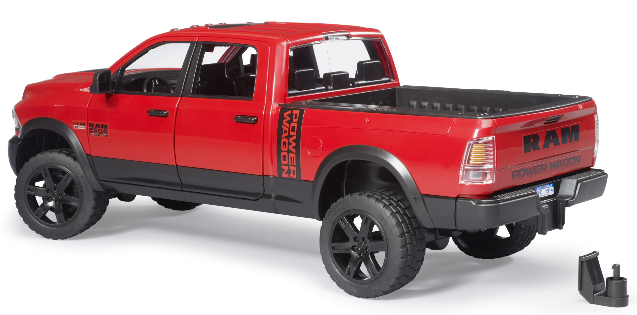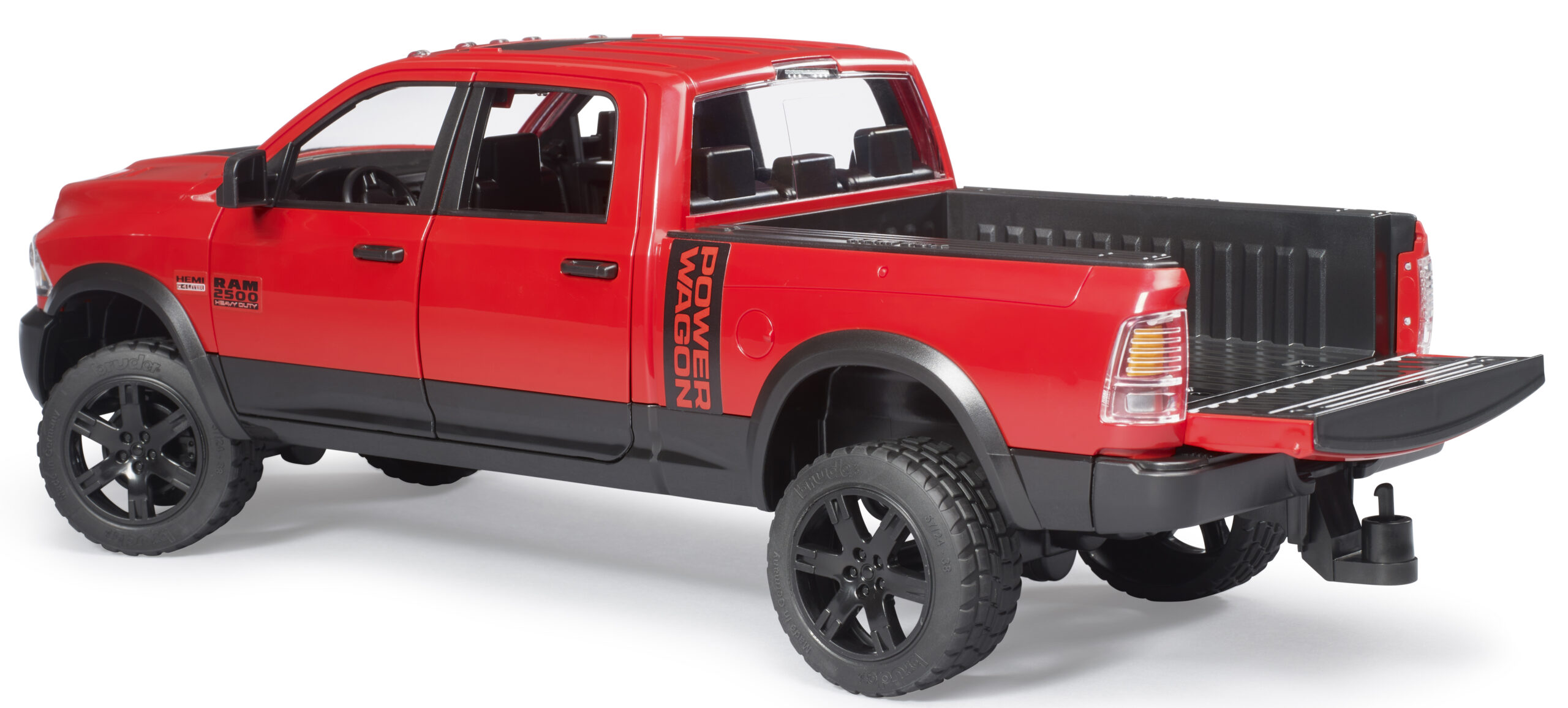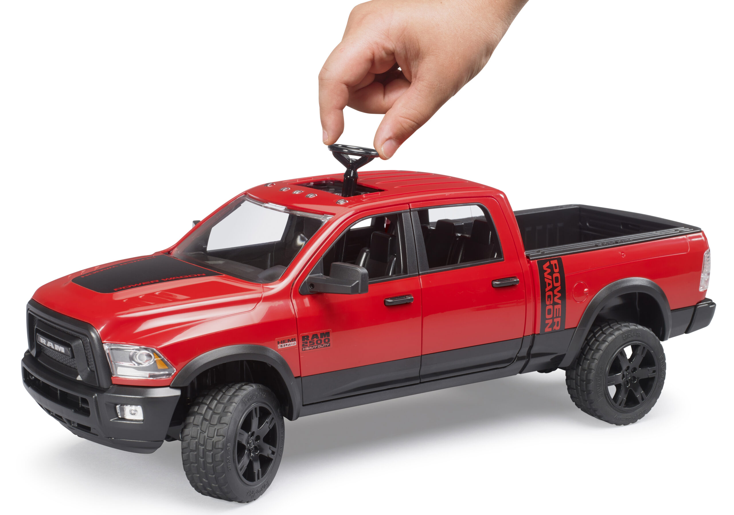 This impressive heavy-duty pickup truck is built to handle the toughest tasks on the construction site or the farm. The ram 2500 power wagon features a crew cab with four opening doors, allowing up to four bworld figures to sit comfortably inside. The suspension is fully spring-loaded on both axles, ensuring smooth driving over rough garden terrain or carpet obstacles. For precise control, an extension steering rod can be inserted through the sliding roof panel.