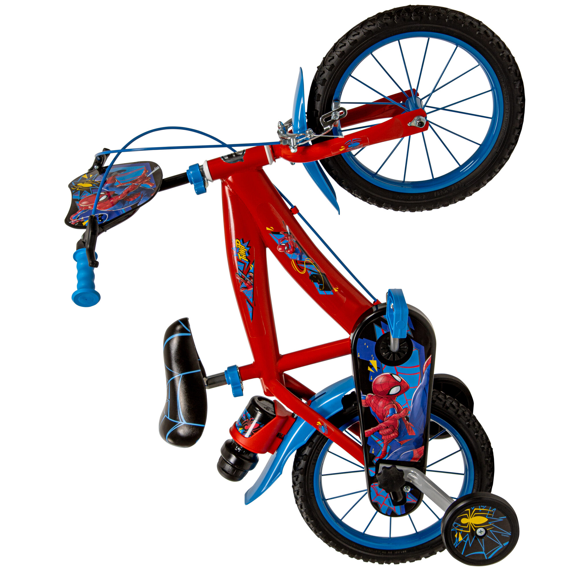 This Marvel Spider-Man licensed bicycle comes with a front calliper brake and a rear drum brake. it features 14 inch pneumatic tyres on spoked wheels mudguards, it also has removable stabilisers. This 14 inch bicycle also comes with an adjustable saddle and handlebars and also comes with a rear drinks holder and bottle and a large front shield featuring Spider-Man. Suits ages 4 – 6 years. Child height range 100 – 110 cm.
